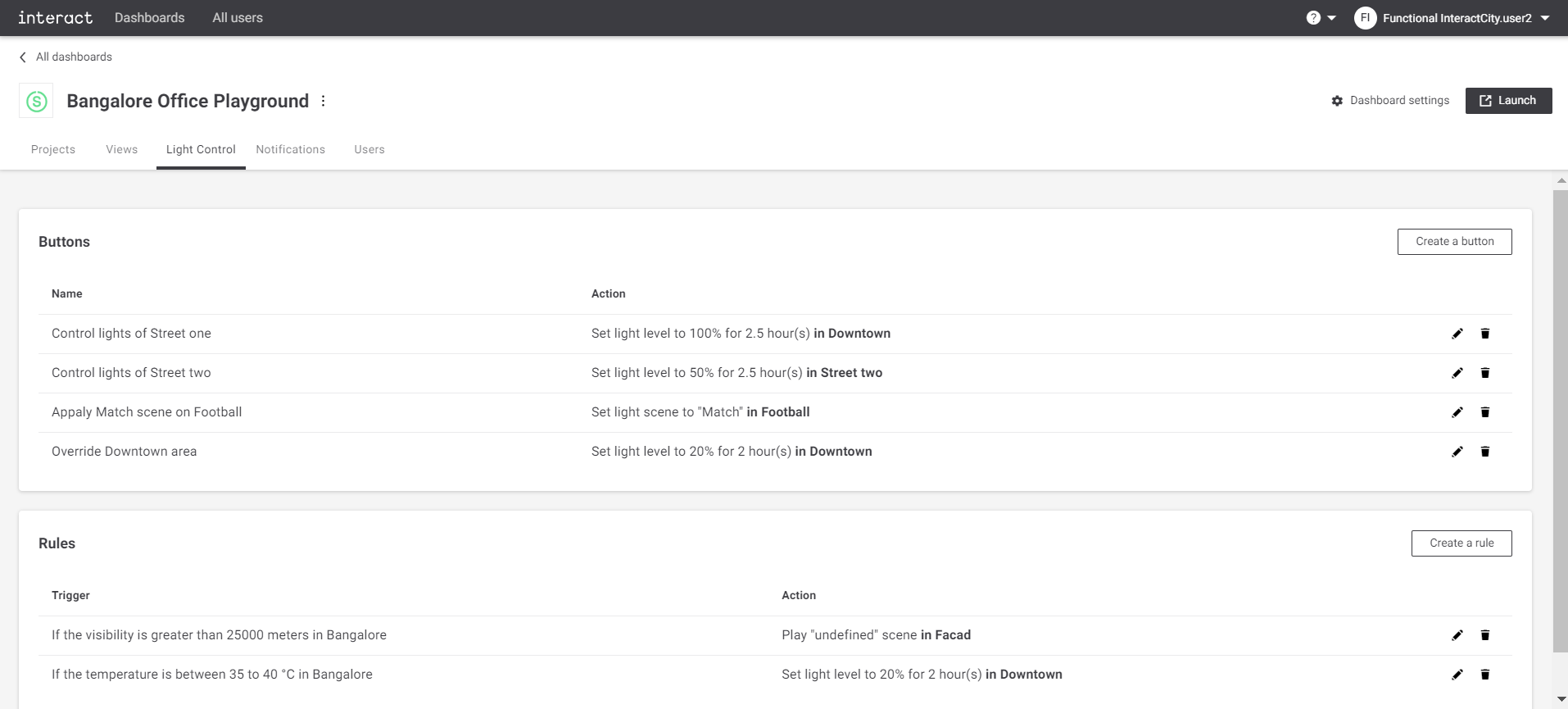 Click the Light Control tab. It shows an overview of configured buttons and rules for the dashboard.